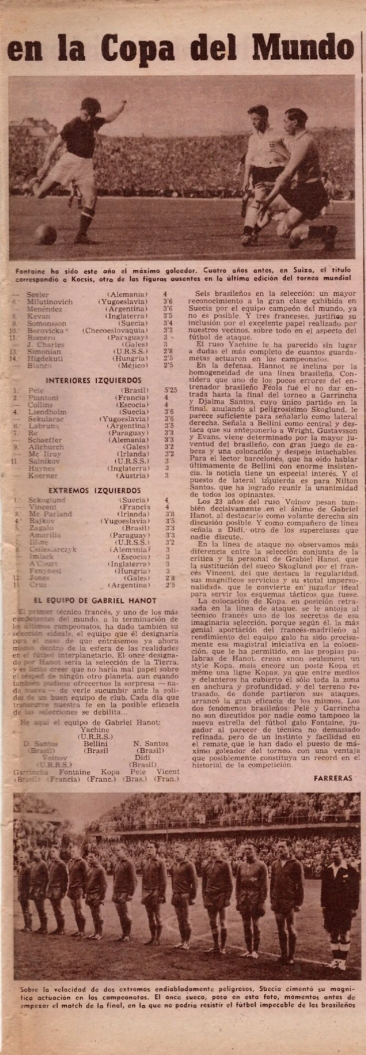 Принято считать, что Швеция была звездным часом Яшина, однако по версии французов он лишь в пятерке. Кстати Яшин ни на одном из своих 4 ЧМ НИ РАЗУ не входил в символическую сборную, что однако не мешало считать его лучшим вратарем столетия. Кстати, интересно было найти и посмотреть оценку Яшина за тот злополучный матч с Чили в 1962 году, вокруг которого так много мифов и легенд, и за который его подвергли остракизму на родине. Так вот ФФ поставил ему твердую двойку (худшая оценка в команде),что косвенно подтверждает ошибки Льва Ивановича. Ниже балл на том ЧМ получали только болгарин Найденов да аргентинская парочка Рома-Домингес-единицы. Первый за 6 от венгров,второй за три от англичан. А что такого натворил Домингес в нулевой ничьей с мадъярами для меня загадка.