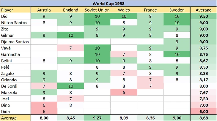 Пеле: 9 Диди: 9 Вава: 9 Зито: 9 Нилтон Сантос: 9 Жилмар: 9 Беллини: 8 Гарринча: 8 Загалло : 8 Орландо: 7 Де Сорди: 7