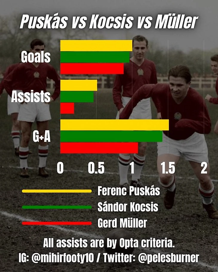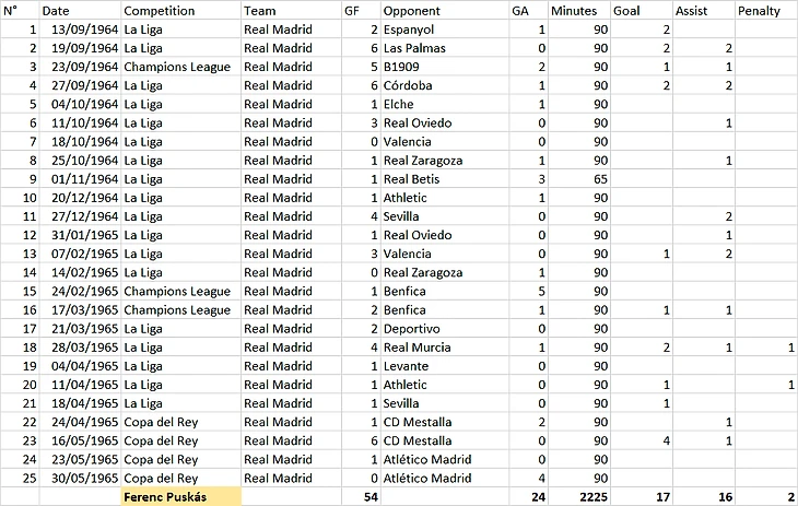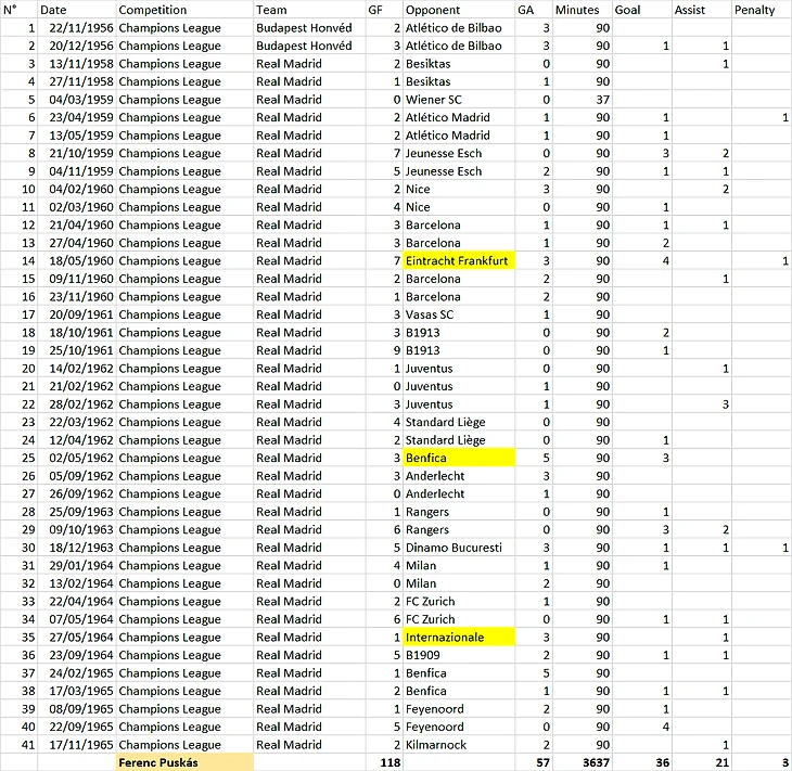 Касаемо цифр Пушкаша. Как вы уже поняли, но по великому венгру тоже проведена тщательная ревизия его подвигов. В основу легли данные базы