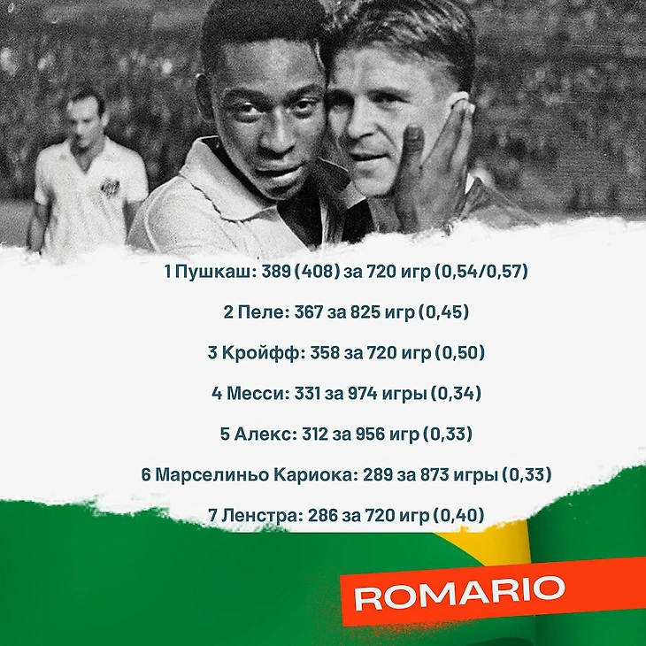 Добавьте сюда признанные ФИФА 708 голов и вы поймете, что даже не Пеле был первым кто набрал 1100 баллов по системе гол+пас.