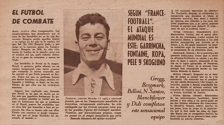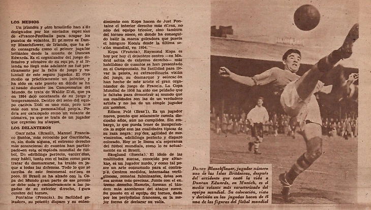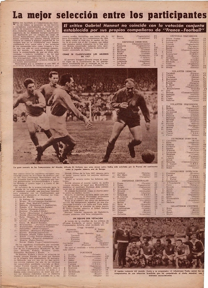 А вот Пеле лишь в середине списка по версии бразильского издания. Возможно им приелся за сезон его талант. Французы же были от него без ума, заметьте, он фигурирует на позиции левого инсайда. Вот версии France Football в нескольких вариациях. Оценки игрокам на ЧМ выставлялись всем поголовно, максимальный балл 6. И Пеле по оценкам французов является лучшим игроком того Мундиаля 5,25 против 4,8 у Диди. Еще одна историческая коллизия.