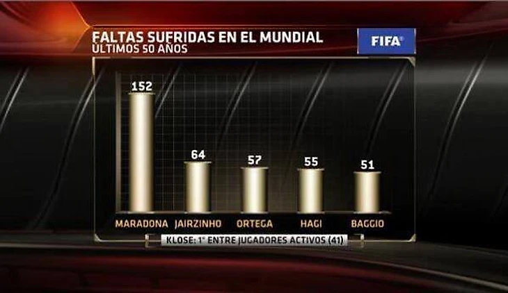 Для лучшего понимания самый высокий показатель на чемпионатах мира - 53 фола- был у Марадоны в 1986 году. На игроках альбиселесте соперники совершили 149 фолов в 7 играх Марадону за 630 сыгранных минут сбивали 53 раза, сам Эль Дьего совершил всего 10 нарушений. Заработал на себе 35,6% от общего числа фолов.