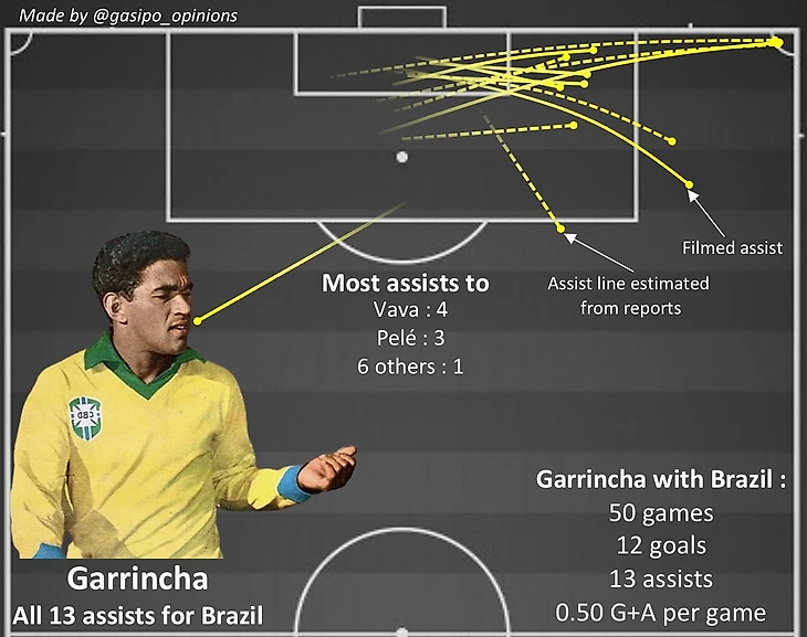 Кстати и великий Жерсон, еще один "незаслуженно забытый" "официант" Пеле отдал всего 16 передач за 54 игры за сборную. Как там писали-с сотен передач Жерсона забил тьму голов, а потом не включил в список лучших в истории, какая тварь неблагодарная....