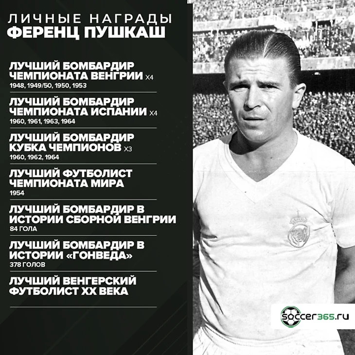 А теперь перенесемся на другую сторону океана и ...поговорим о "липовых" Золотых мячах у претендентов на звание одного из лучших в истории, и по совместительству лучшем ассистенте в истории футбола. Выдохните, речь пойдет о Пушкаше. Много ли мы знаем об этом футболисте? Пожалуй то,что он был членом великой сборной Венгрии и "Реала", так? Великий бомбардир, "одноногий" причем, выраженный левша. А давайте посмотрим на его карьеру. Она достойна внимания и уважения. Он играл в лучших лигах мира (венгерская и Ла Лига), лучшей европейской и возможно лучшей сборной в истории, по крайней мере ФИФА небезосновательно об этом говорит, играл в финале ЧМ, трижды брал ЛЧ в составе европейского гранда и гегемона.