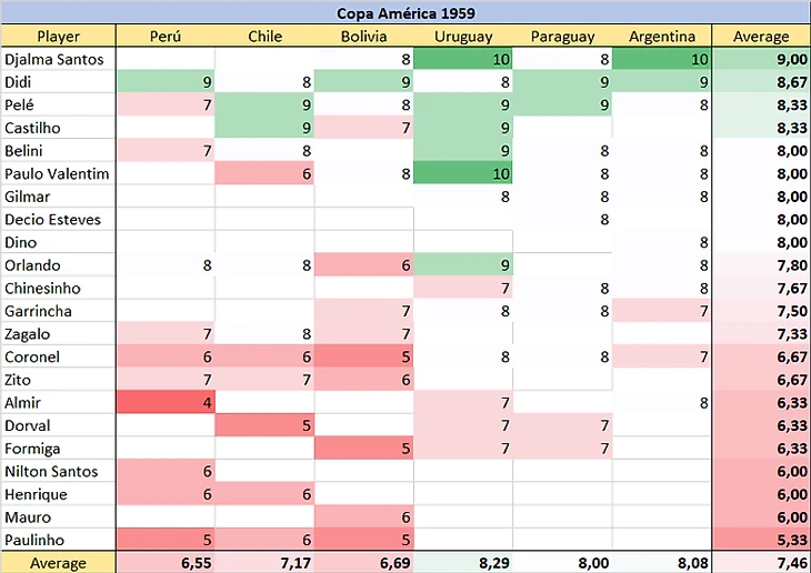А это сводная таблица Копы Америка-59 со средними оценками и как любите пруфы/сканы на каждый матч. Согласно Manchete Esportiva