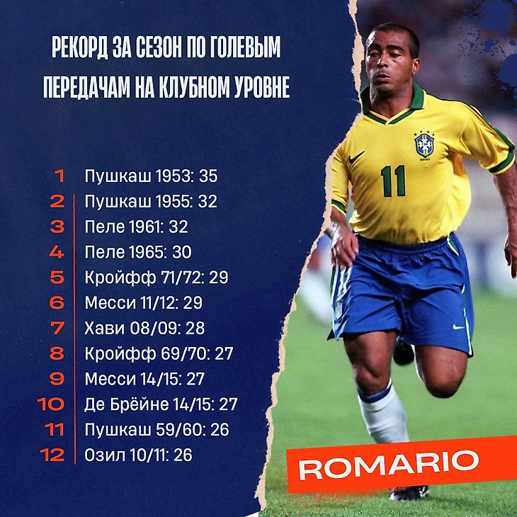 Пушкашу с Пеле также принадлежат рекорды и по голевым передачам за сезон.