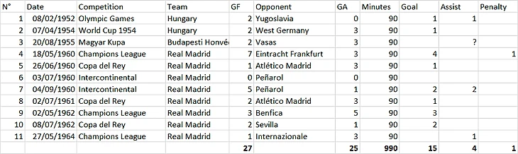 И конечно работа с первоисточниками. С венгерскими работали носители языка, уж больно тяжелый. А с испанским этапом карьеры проще-данные взяты из Mundo Deportivo и ABC. В подтверждение даю 2 таблицы по обоим периодам. Все так же как по Пеле-дата,соперник,результат,результативные действия,пенальти/штрафной или головой и ссылка на газету,по испанскому периоду 2 ссылки.