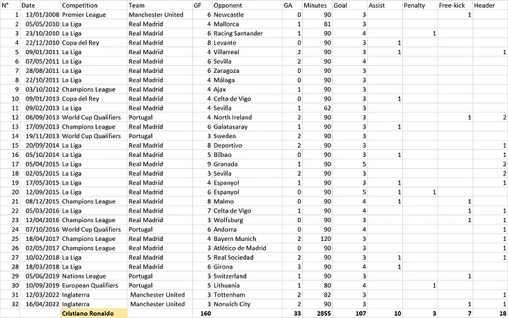 Криштиану Роналду-32 (в них 7 голов со штрафных и 18 головой)