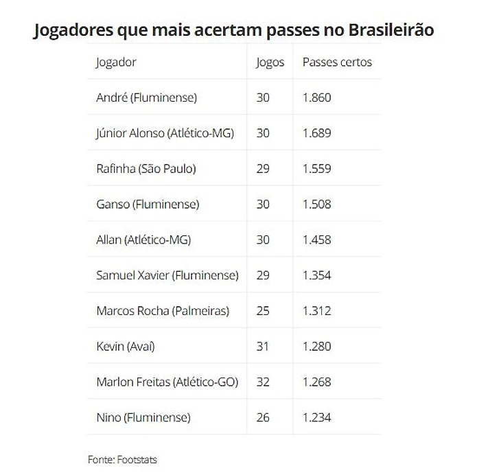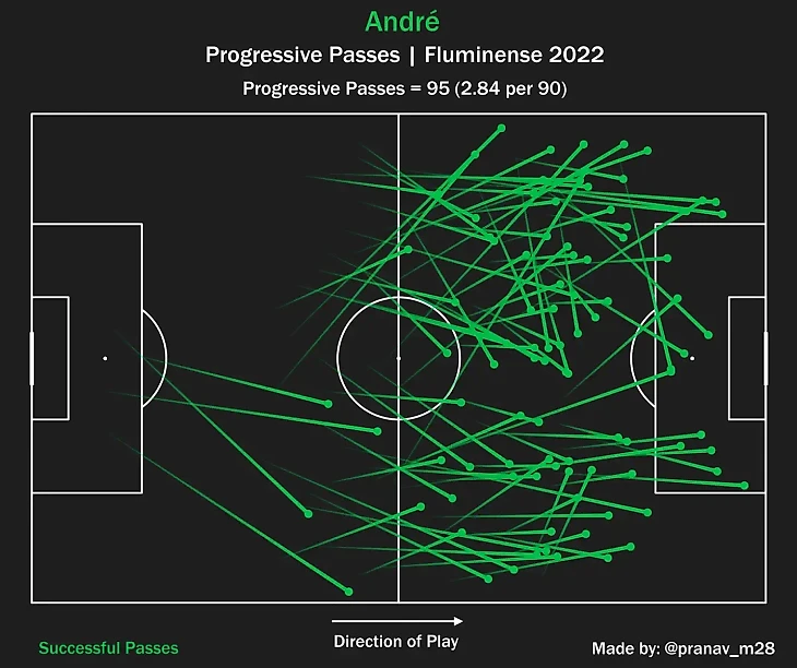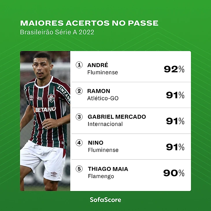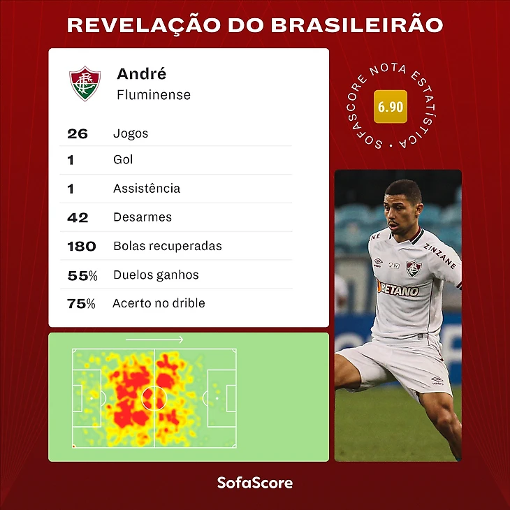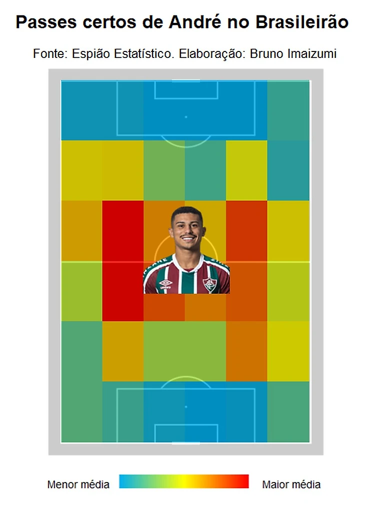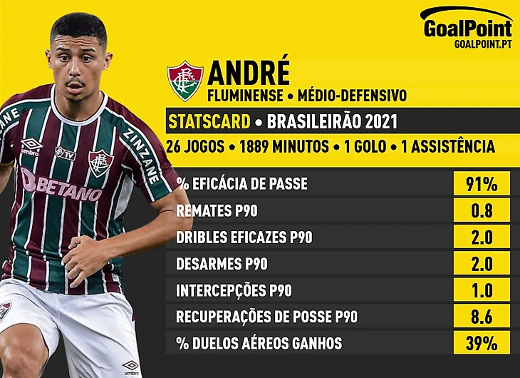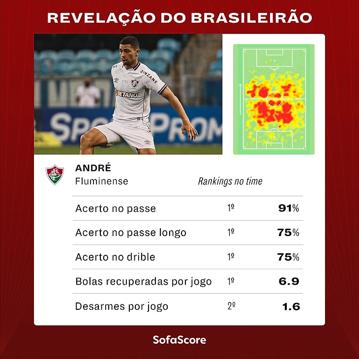 Андре пропускает через себя огромное количество мячей и имеет огромное влияние на построение атак «Флуминенсе» как в первой трети поля, так и во второй. В текущем сезоне Андре работал с мячом больше всех в лиге – он отдал партнёрам 1860 передач за 30 игр.