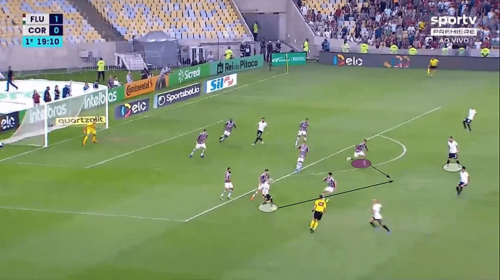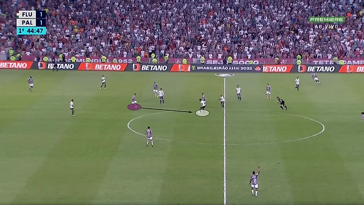 Ускорения 21-летнего воланте Флу — одна из его самых заметных сильных его сторон. С их помощью он может прессинговать противника с невероятной интенсивностью, практически не оставляя времени на принятие решения и обработку мяча. На приведенном ниже фото, полузащитник «Палмейраса» планирует получить мяч, но Андре преодолевает значительное расстояние, чтобы навязать борьбу и вернуть мяч.