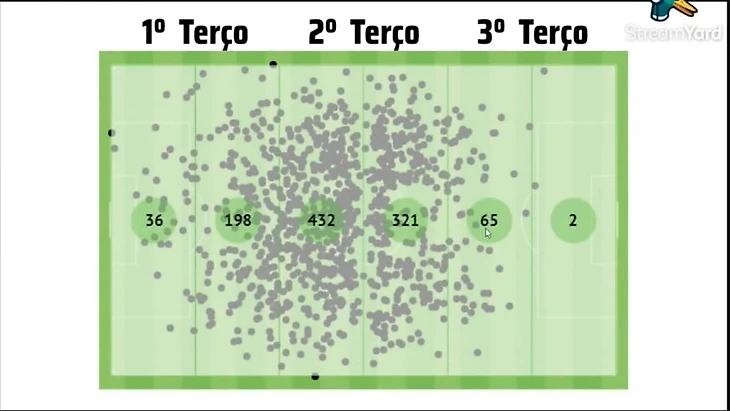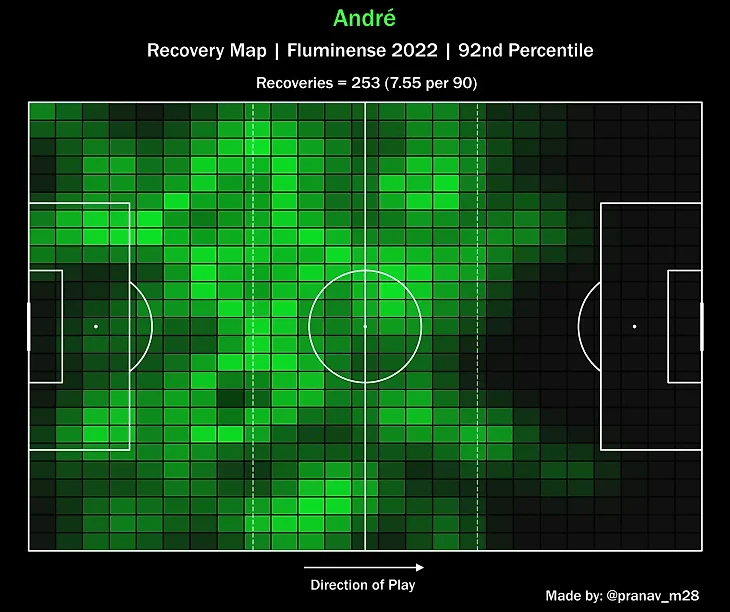 Эту интенсивность также можно увидеть на его карте с высоким прессингом. Поскольку «Флуминенсе» -команда с очень агрессивным высоким прессингом, Андре здесь играет важную роль. Как полузащитнику, находящемуся глубже остальных, ему поручено обеспечивать подстраховку всей командной структуры.Розовые точки обозначают возвраты в ответном прессинге (54), а зеленые точки — опасные подборы (13). Благодаря большому количеству подборов Андре является ключевым элементом агрессивной прессинговой системы Диниза.