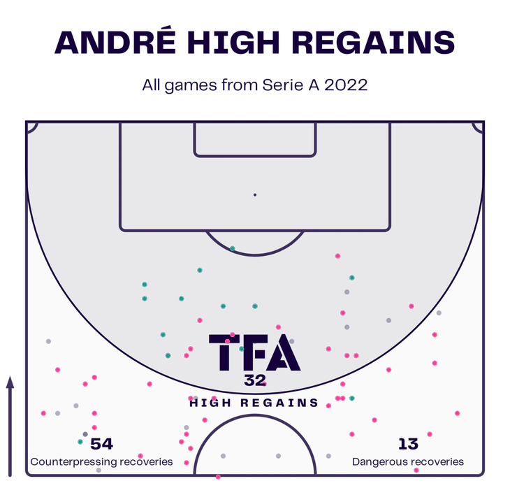 Умение Андре так взрываться, а также чувствовать позицию, делает его крайне полезным и в контрпрессинге. Он любит встречать соперников, пресекая контратаки, и нередко страхует границы штрафной, находясь в районе 14 зоны или на подходах.