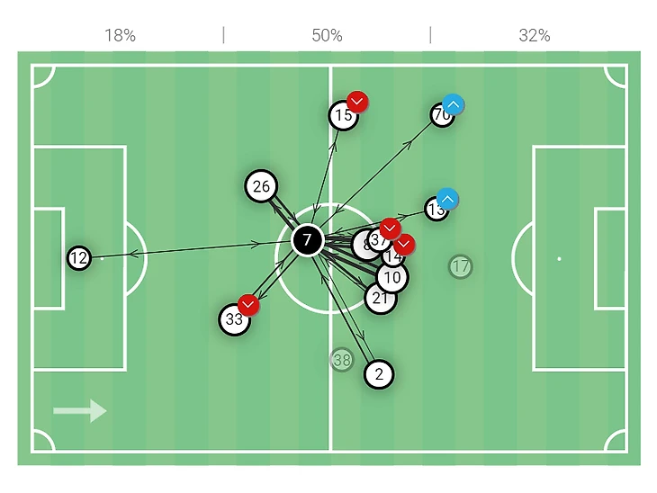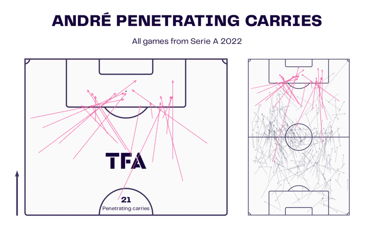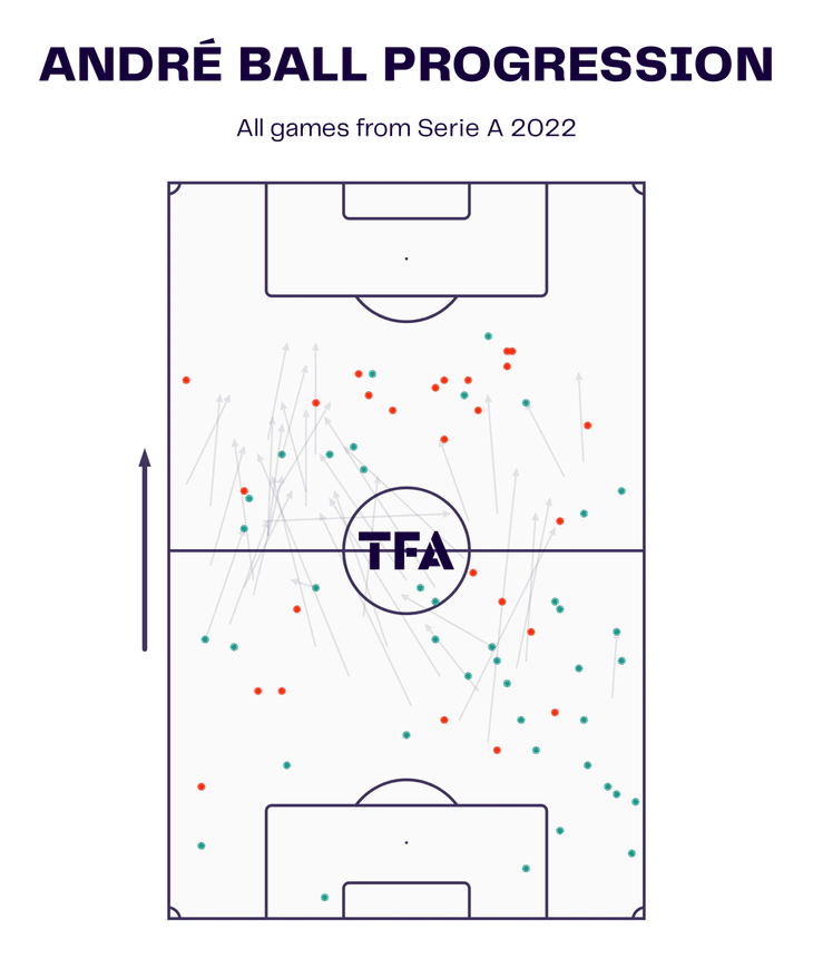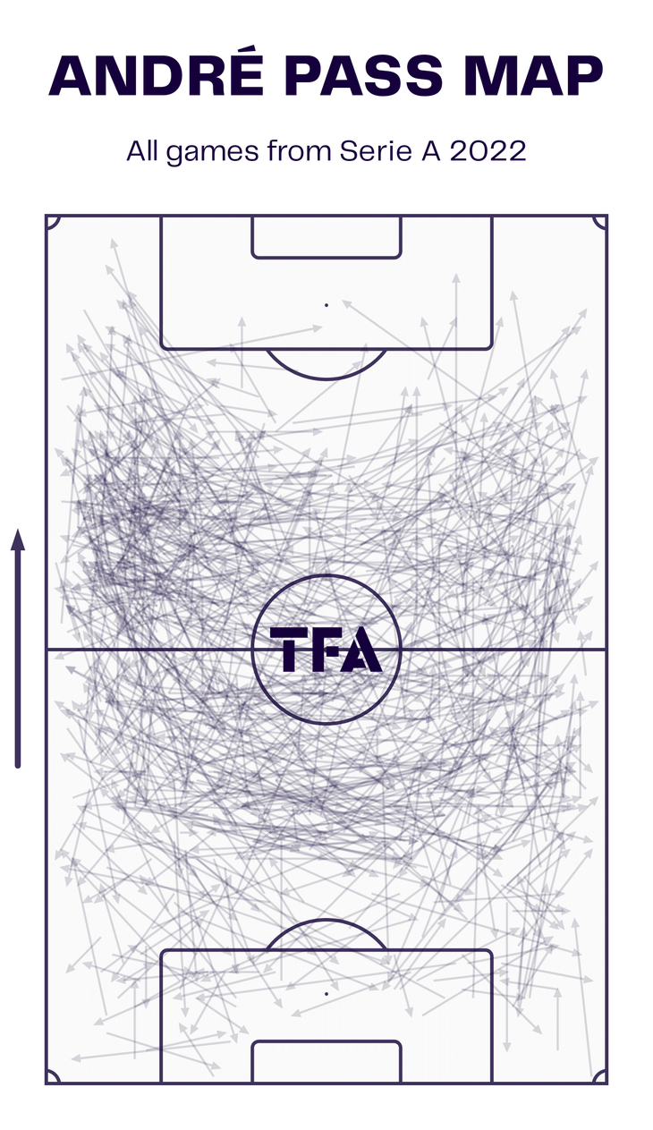 Проиллюстрирую его картой пасов в Серии А. Места передач Андре разбросаны по всему полю, различаясь по направлению и длине. В его собственной трети существует здоровый баланс между боковыми/короткими передачами и прогрессивными передачами вперед. Выше по полю он настолько же динамичен, насколько это возможно.
