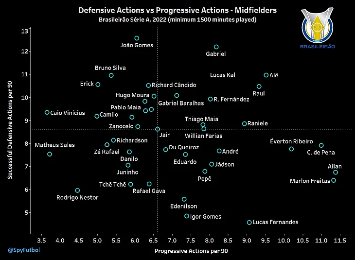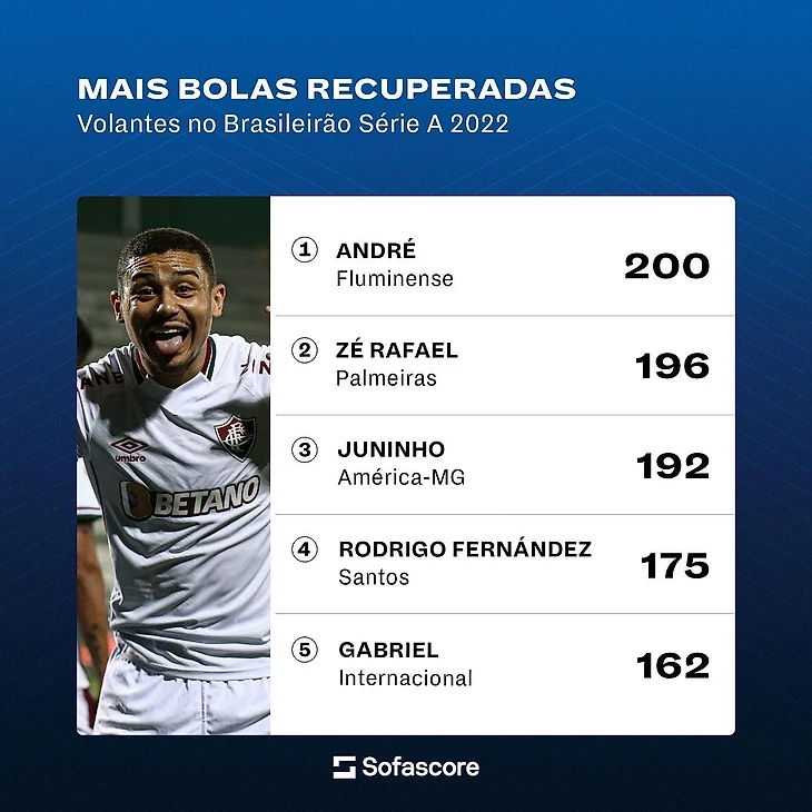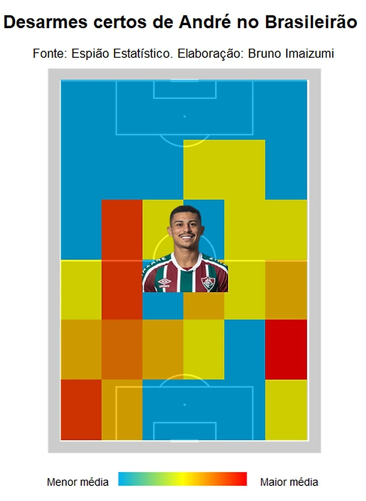 "Флуминенсе" в среднем имеет 59,01 % владения мячом в Серии А-2022, поэтому, естественно, защитные показатели Андре не самые высокие. Например, у него в среднем всего 8,09 успешных защитных действий за 90 минут и 6,06 оборонительных поединков за 90 минут. Тем не менее, процент выигранных оборонительных единоборств очень высок — 63,5 %. Кроме того, с поправкой на владение мячом его показатель перехватов увеличивается до 6,1 .