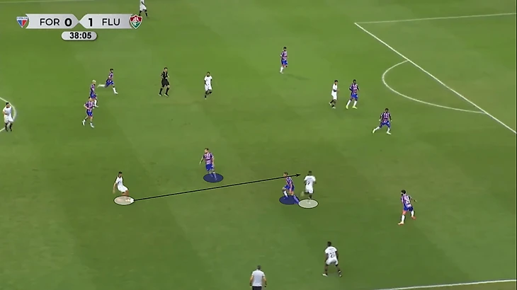 Флу Диниза любит мешать соперникам спокойно начинать атаки, игроки активно участвовали в высоком прессинге. Форвард Кано и вингеры Ариас и Матеус Мартинс работают по защитной линии соперника, атакующий полузащитник Гансо разбирал опорников с кем-то из пары Андре/Мартинелли. Андре обычно выбирал распасовщика противоположной команды. При этом Андре располагается изначально близко к сопернику обычно лишь при ударах от ворот, в остальных случаях он обычно поднимается из глубины, но резко, преодолевая расстояние за пару секунд.