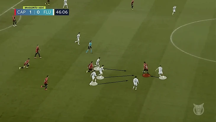 Пример Андре в контрпрессинге. «Атлетико Паранаенсе» пытается начать контратаку . Как только их центральный нападающий получает мяч, Андре оказывает давление сзади, в то время как его товарищи по команде перекрывают другие направления развития атаки. Андре овладевает мячом и начинает новую атаку.