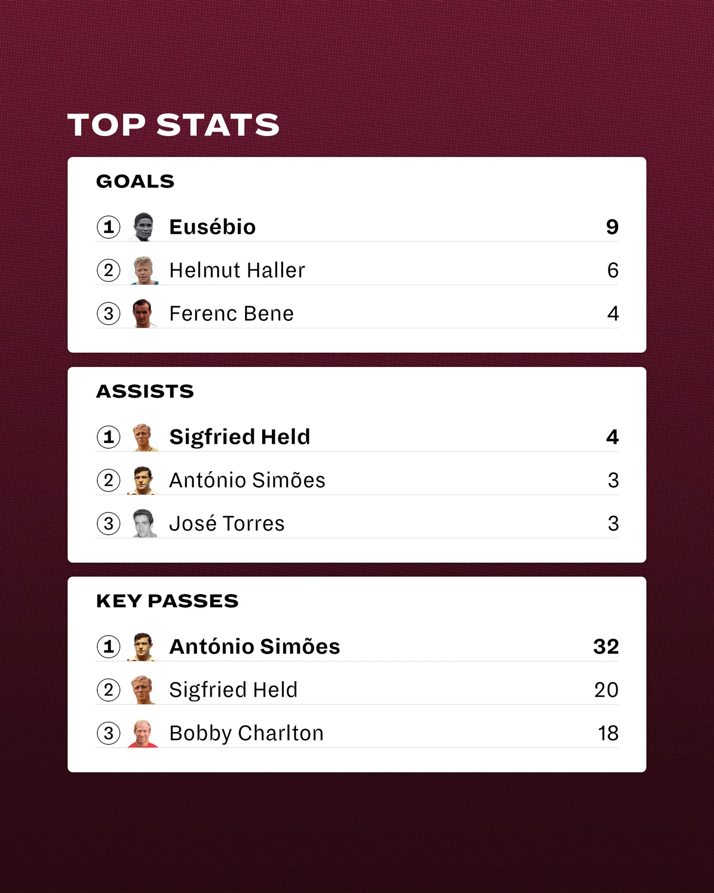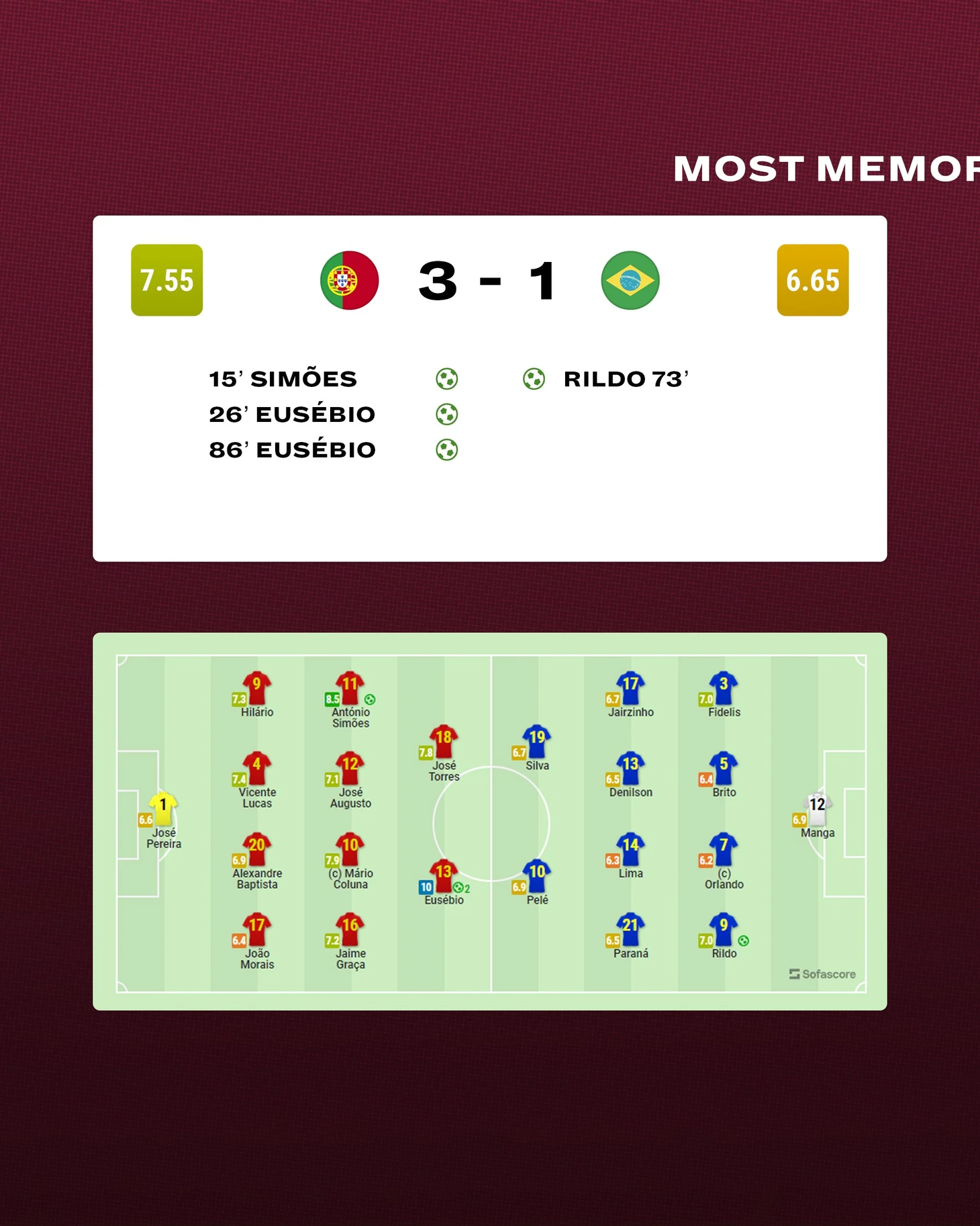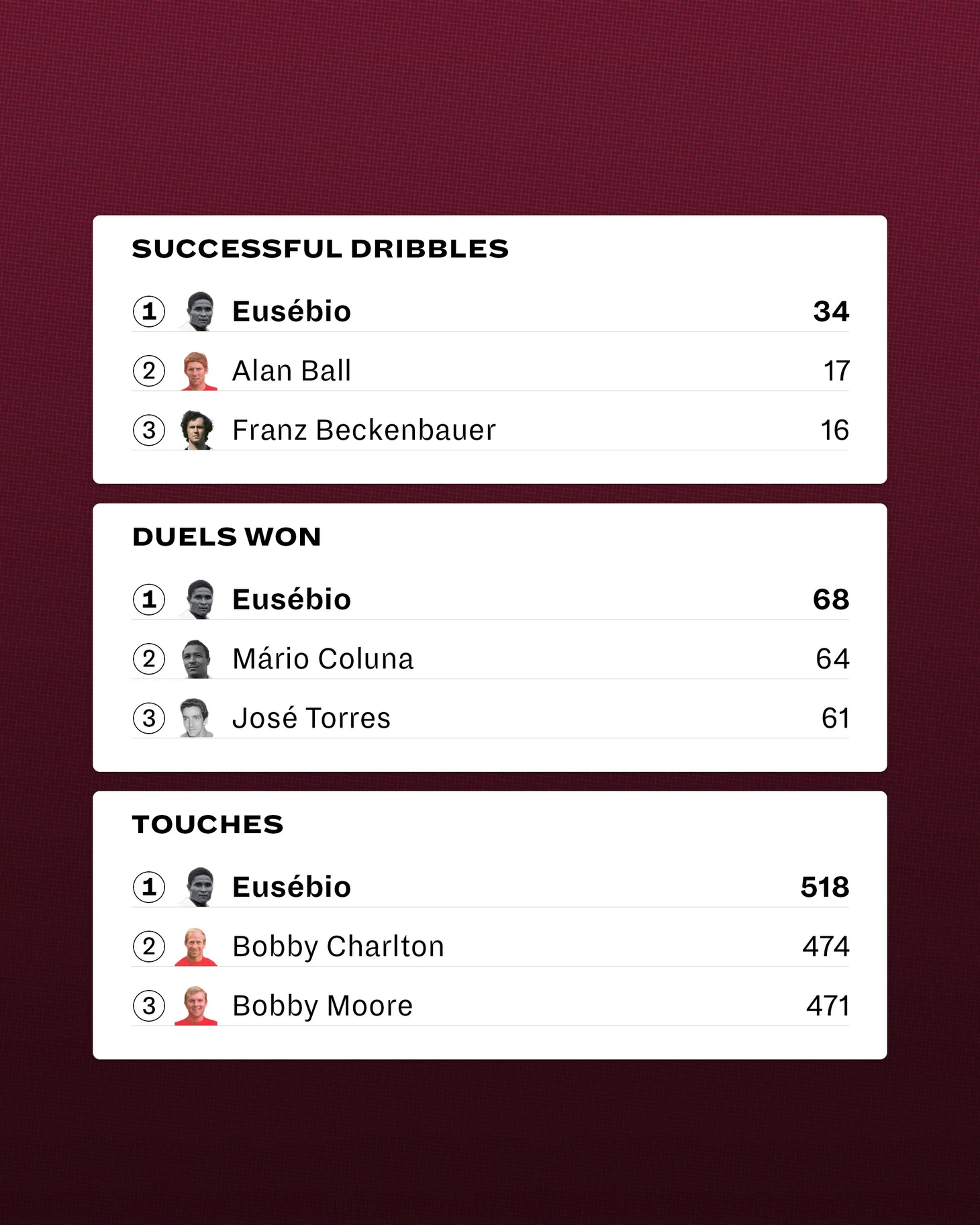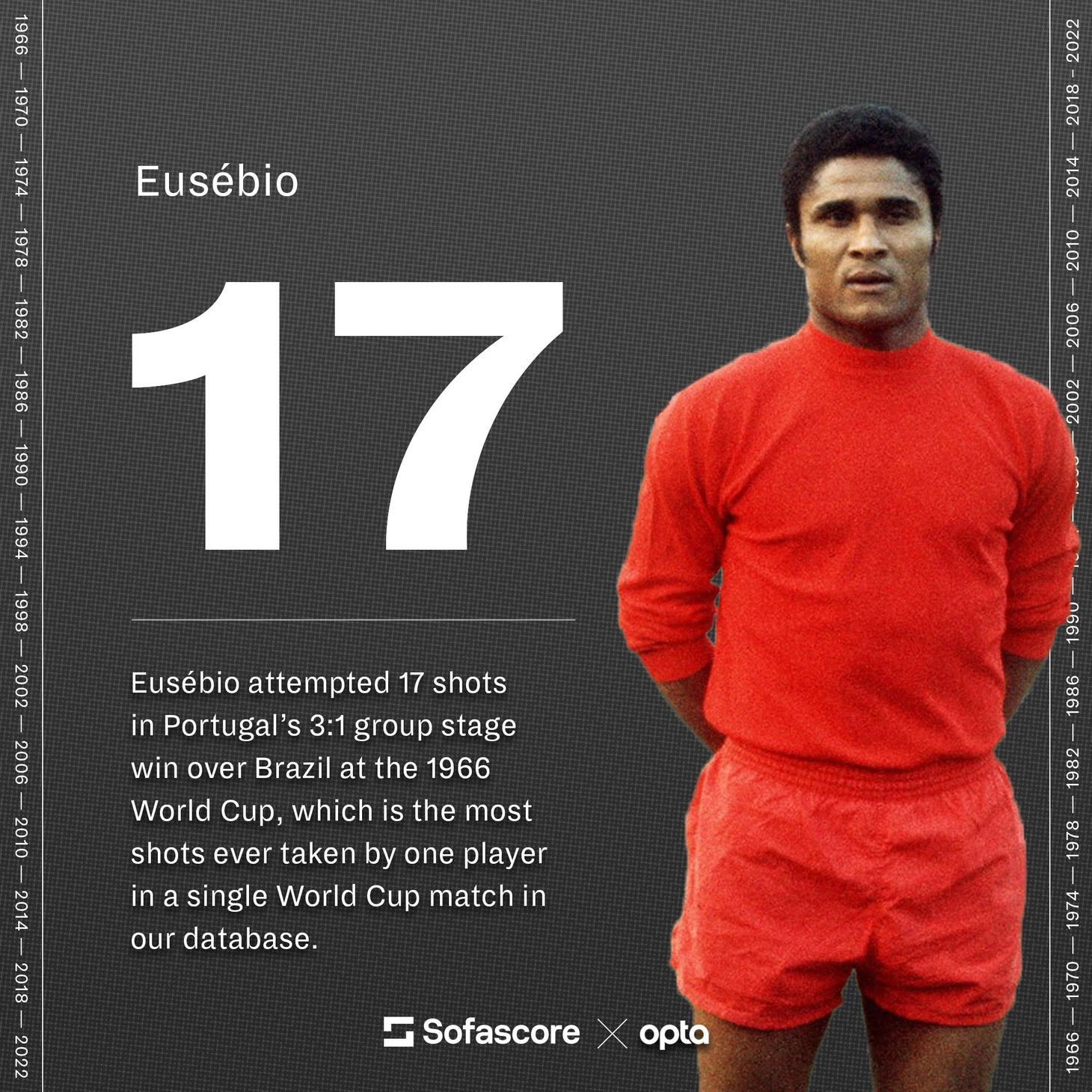 Эйсебио принадлежит и рекорд ЧМ-в матче с Бразилией он нанес 17 ударов по воротам. Из них правда всего 7 попали в створ.