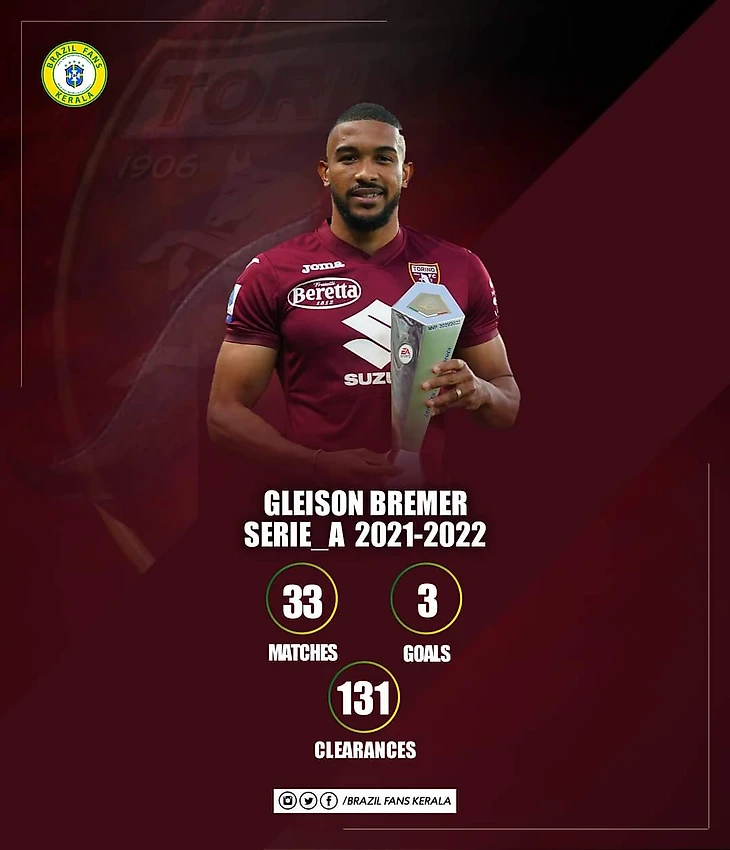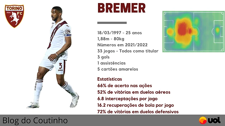Родной город 25-летнего защитника сборной находится недалеко от Ильеуса, в регионе Какао штата Баия. Когда он уезжал двадцатилетним пареньком из "Aтлетико Минейро" Бремер весил 78 кг После первого сезона в Турине уже 82 кг, а сегодня новичок Селесао весит 86 кг. Это результат дополнительной работы. Но Бремер набрал эту мощь без потери скорости. Сейчас скорость его бега во время матча достигает 35 км/ч. .