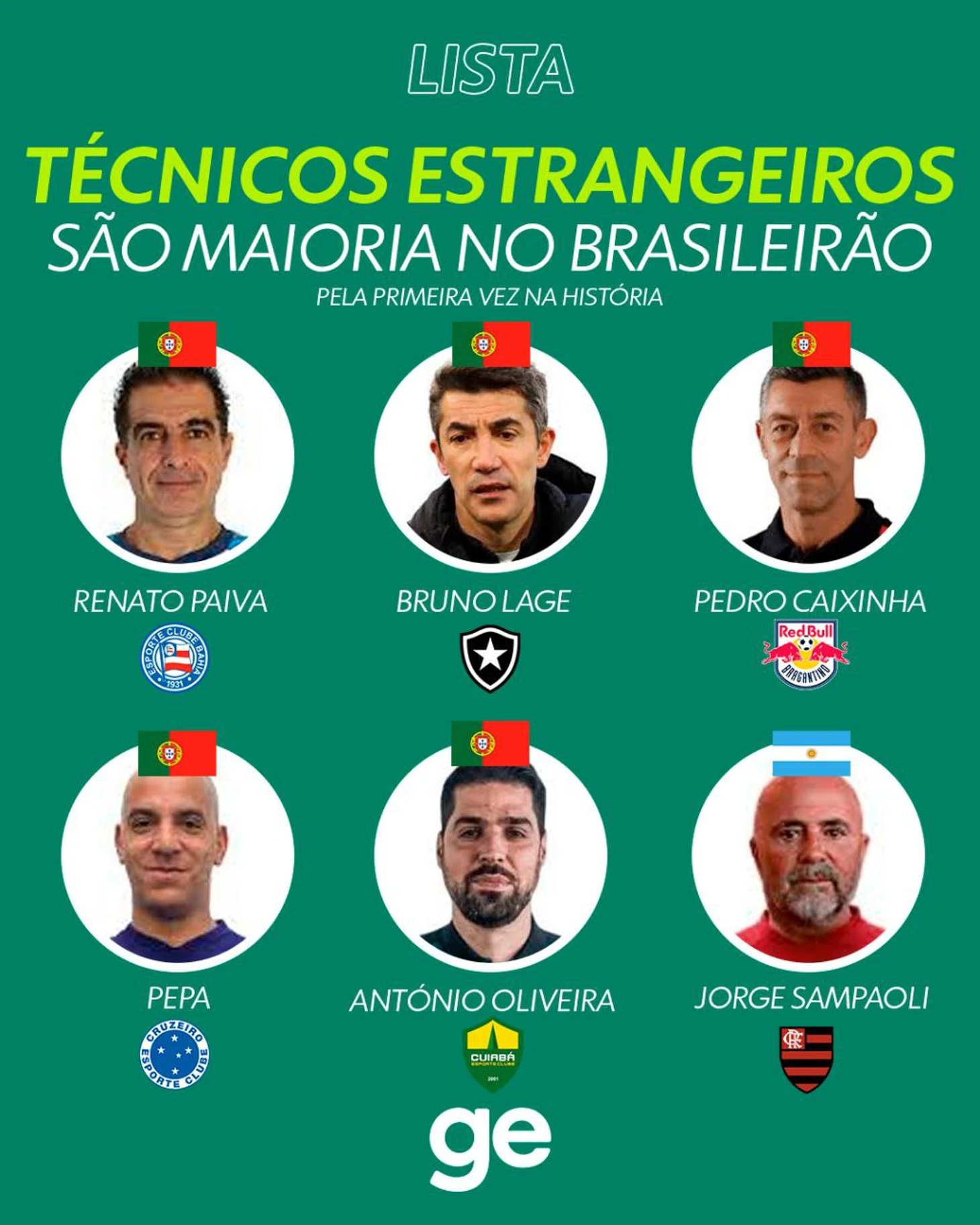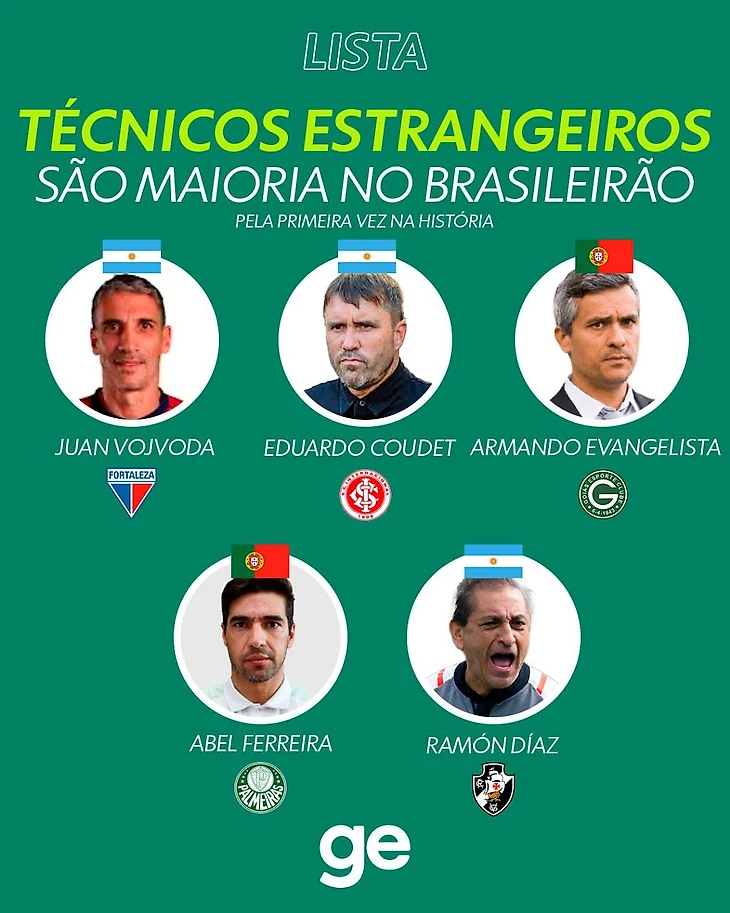 Антирекорд про тренерам-гринго. Теперь их 11 из 20. Среди старых новых знакомых-Эдуардо Куде в «Интернасьонале» и Рамон Диас в «Васко». Ну и наконец должен дебютировать на мостике Бота Бруно Лаже