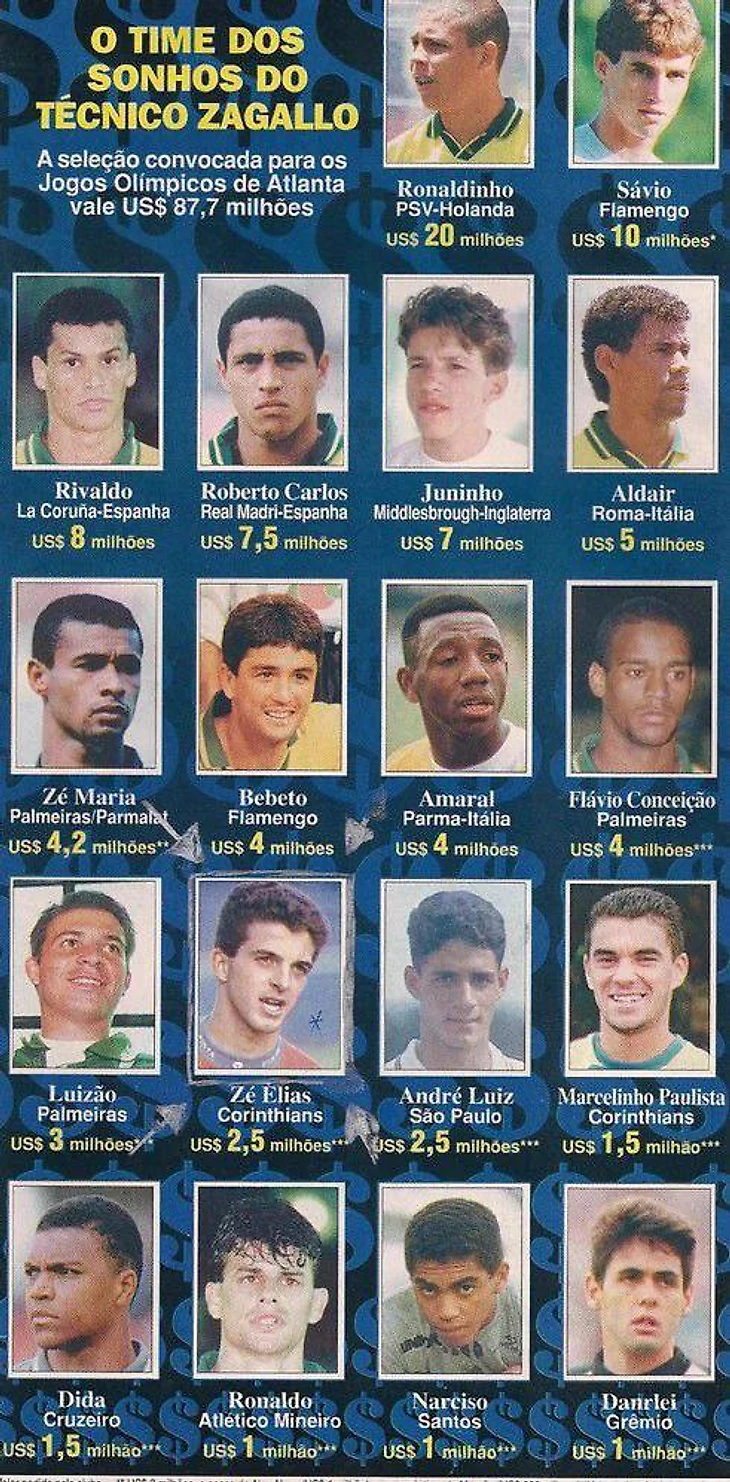 Шарился я надысь по всебразильским архивам и наткнулся на прелюбопытнейшую вещицу. Ценник на сборную Бразилии на Олимпиаде в Атланте 1996 года