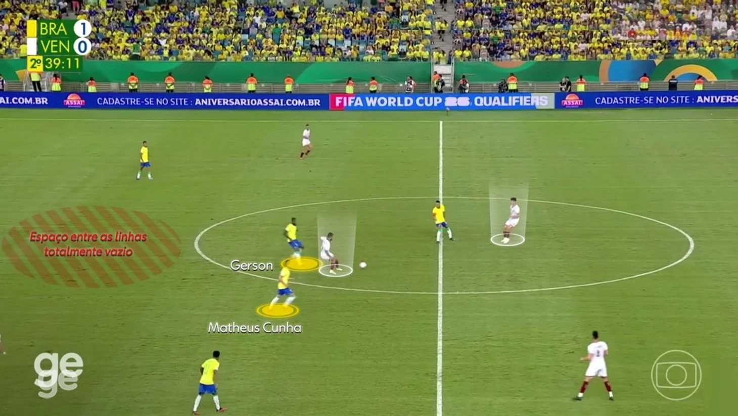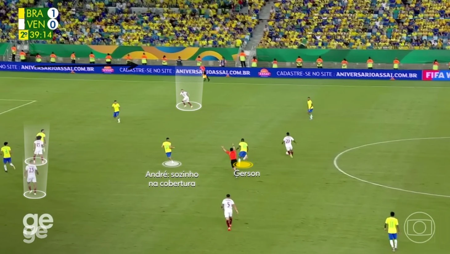 Жерсон снова разворачивается и возвращается, но не мешает мячу продвигаться. Венесуэле удается атаковать при численном равенстве. Вингер находится с защитником, а два нападающих - с двумя защитниками. Связь между линиями? Подстраховка? Не существуют.