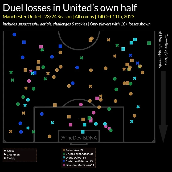 Каземиро понимает игру, пытается обострять, отдать интересный пас, открыться для приема в ногу или в будущую точку, но у него нет такой большой маневренности, ему немного сложнее с мячом в более перегруженном пространстве. И здесь вопрос-это временное связанное с притиркой к стилю Диниза или это временное связано с плохой формой. Пообщался с пабликом Юнайтед, они говорят-смотри, Карлос ужасен на старте сезона. По количеству обрезов перед своей штрафной и проигранным единоборствам он худший у «дьяволов».
