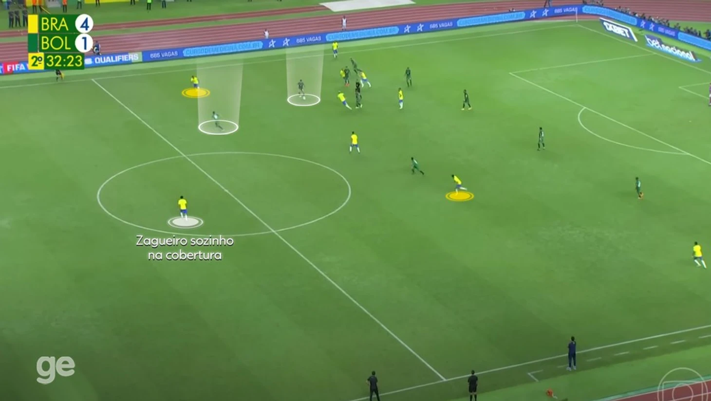 Аналогичная проблема случилась и против Боливии: Бразилия уже выигрывала со счетом 4:0, внимание немного снизилось и защита полностью оголилась, когда соперник перехватил мяч и запустил своего форварда в зону на скорости. Это снова ситуация 1 против 1, которая подвергает игрока индивидуальной ошибке.