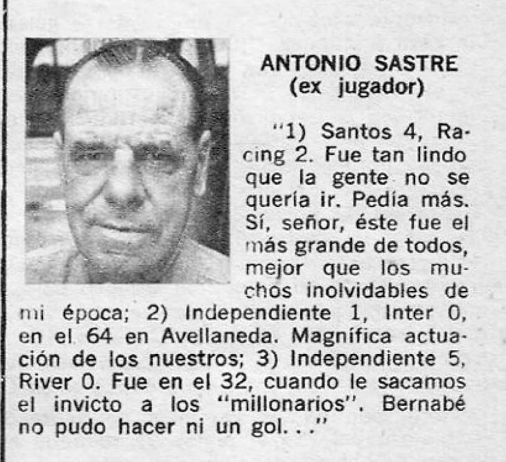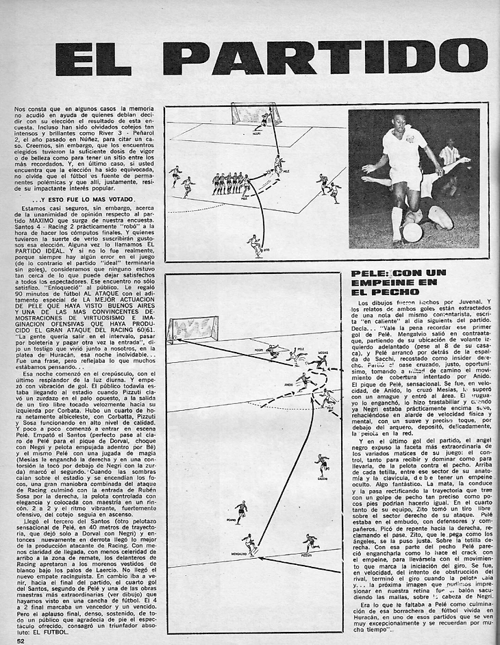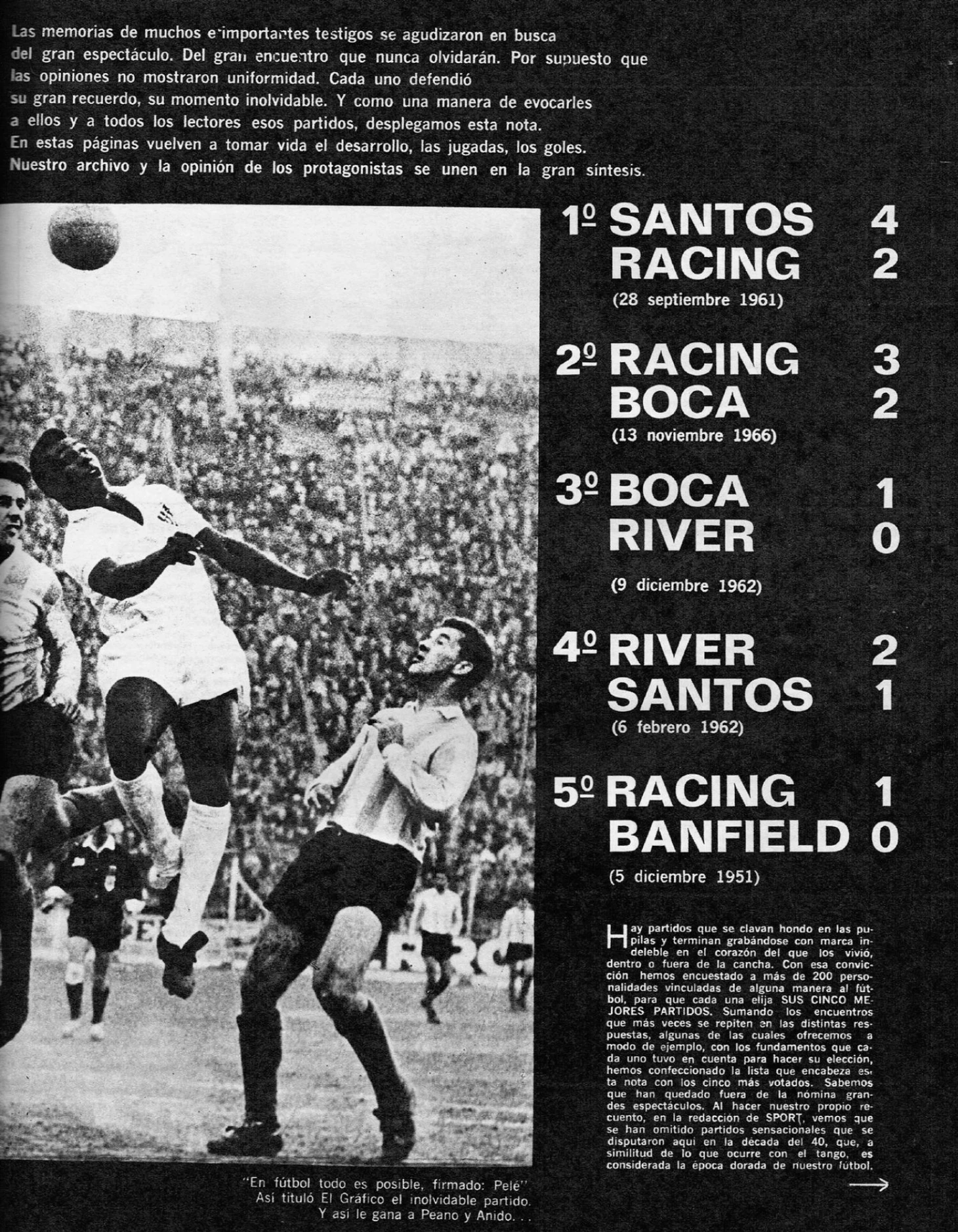 В 1967 году 200 знаковых персон аргентинского футбола (игроки,тренеры, журналисты) попросили назвать лучший матч, который они когда-либо видели в своей жизни. Самым популярным матчем стал матч «Сантоса» с «Расингом» (4:2), сыгранный в 1961 году в Буэнос-Айресе, где Пеле забил 2 выдающихся гола и сделал результативную передачу.