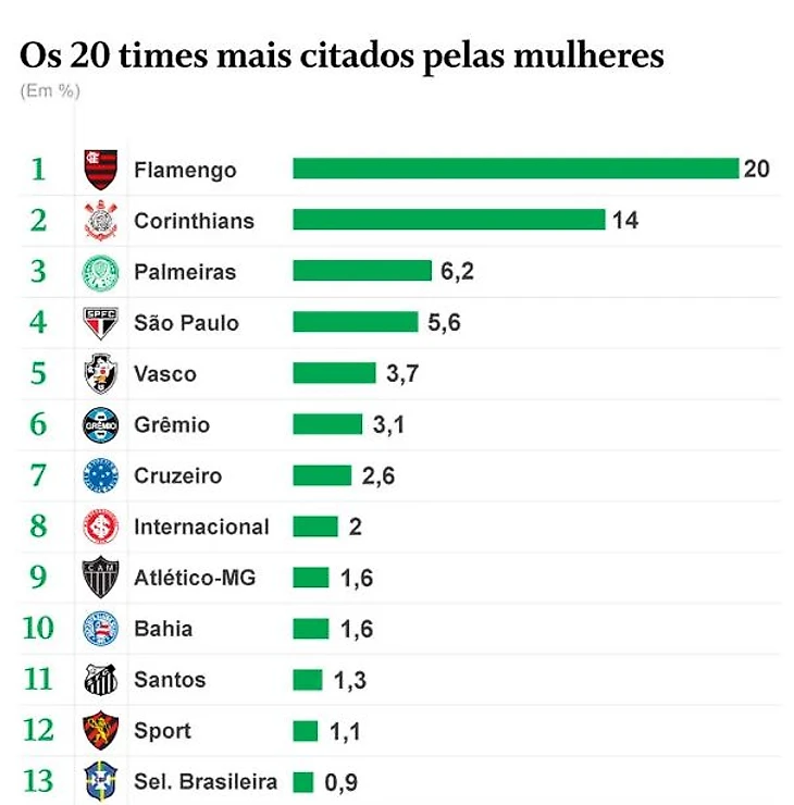 Самый большой прирост женской любви пришелся на «Фламенго», чей индекс вырос с 19% до 22%. «Коринтианс», занимающий второе место, увеличил свою торсиду на один пункт, с 14% до 15%.
