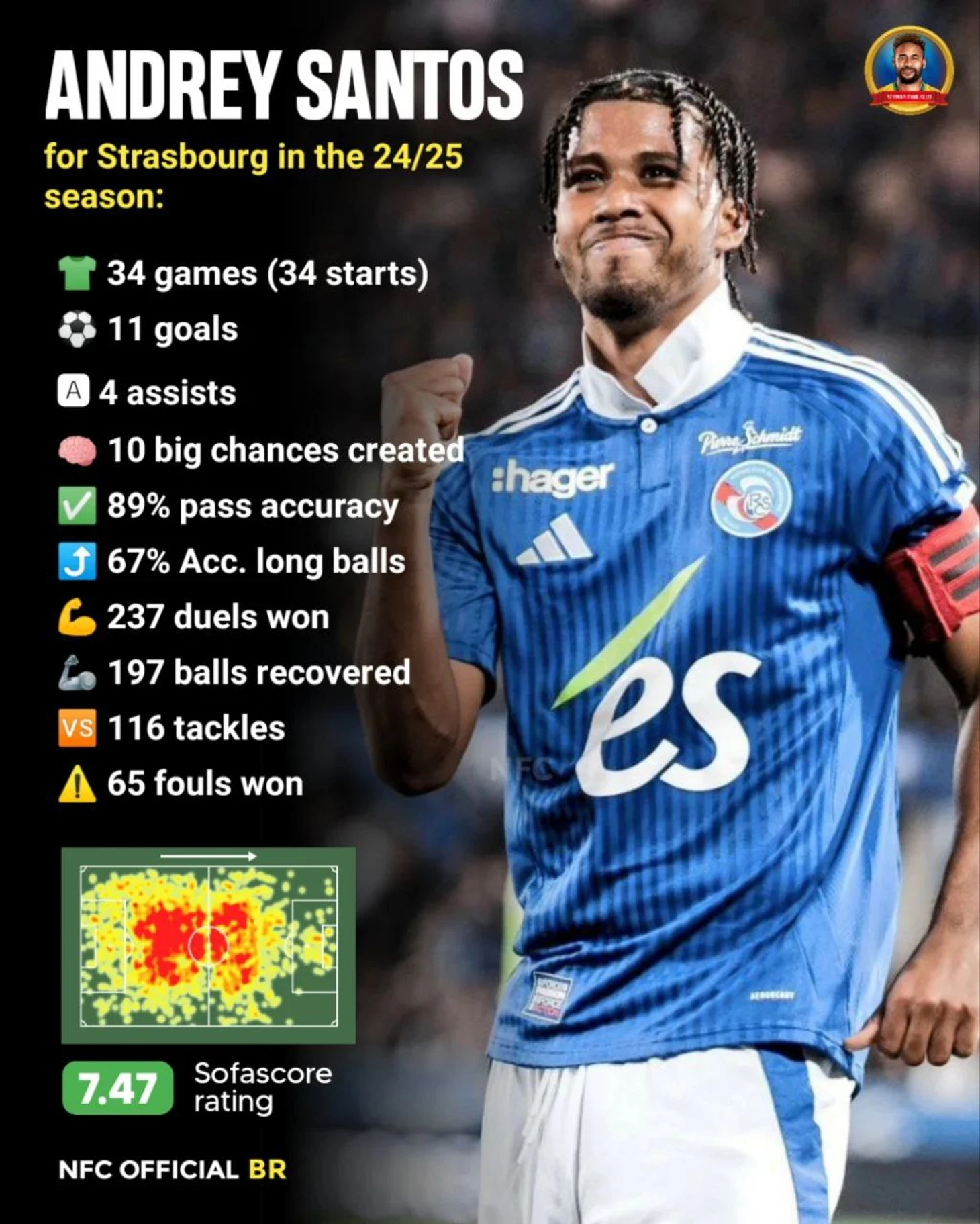 Сантос также возглавил рейтинг Лиги 1 по результативности в дуэлях, учитывая, что 54 игрока приняли участие не менее чем в 250 дуэлях (66,7%), и он был среди всего лишь 11 игроков в турнире, которые отвоевывали мяч у соперника и начинали комбинации, которые заканчивались ударом, в 13+ случаях (13).