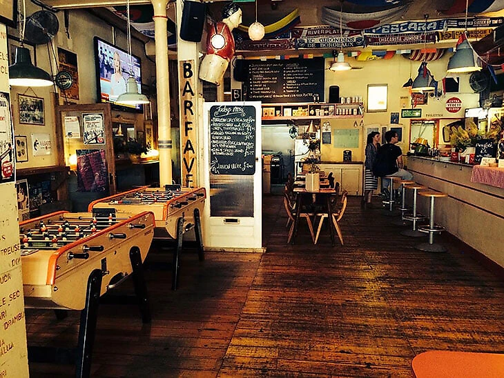 Внутри – столы для настольного футбола, дешевое пиво, флаги и шарфы на потолке.