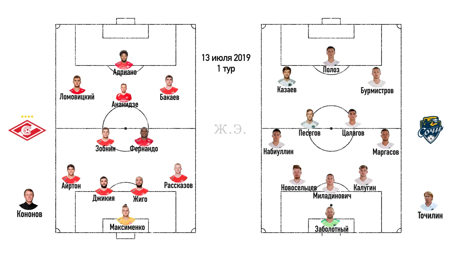 В том матче, кстати, "Сочи" откровенно возил "Спартак" весь первый тайм. Подводила реализация и спасал Максименко. Второй тайм был нулевым и по счету и по игре и только в добавленное время Жиго перебинтованной головой послал мяч в ворота. Не без нарушения, как показалось. В недавней же игре 11 июля, "Спартак" играл откровенно лучше, но проиграл благодаря автоголу Маслова.