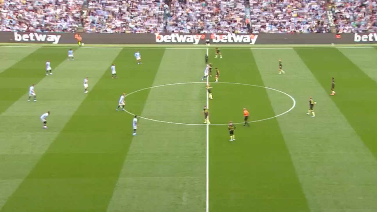 Практически те же структуры, ни одного игрока на поле, кроме тех, кто находится в нескольких метрах от центрального круга, семь человек выстроились поперек линии полузащиты, и четверо из них сгруппировались ближе к правой стороне. «Манчестер Сити» использует свою базовую защитную структуру (4-3-3) и лишь слегка сместил всех влево. «Тоттенхэм» тем временем опустил полузащитника Родриго Бентанкура в линию защиты, чтобы временно создать пятерку защитников.
