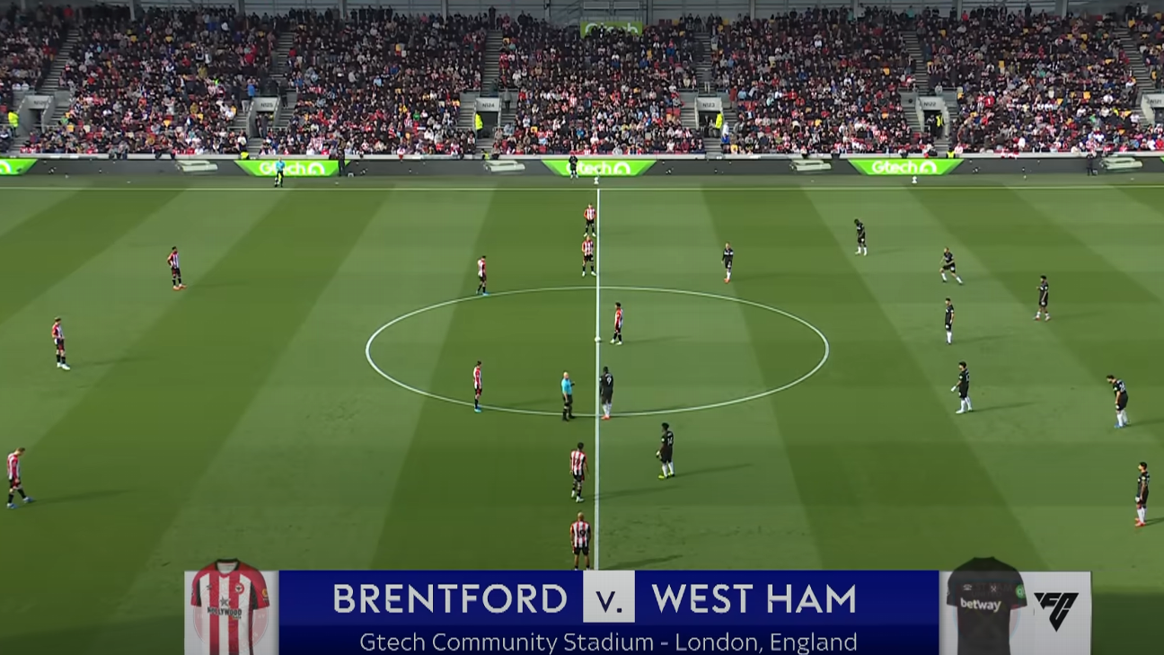 В первых двух матчах «Брентфорд» отдаёт мяч вратарю Марку Флеккену, который затем выбивает его на перегруженную сторону поля. Однако в матче с «Вест Хэмом» «Брентфорд» немного дольше удерживает мяч и перебрасывает его между центральными защитниками, что даёт всем их продвинутым игрокам больше времени, чтобы подняться по полю и собраться в центре, за несколько метров до штрафной. Итан Пиннок в итоге выбивает мяч в это пространство, они выигрывают второй мяч и в итоге забивают.