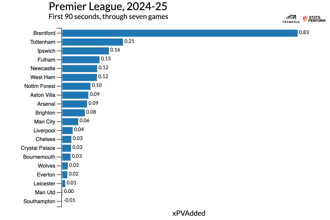 Неудачный пас в штрафную соперника, скорее всего, всё равно принесёт пользу, в то время как длинный пас назад принесёт противоположный результат. За первые 90 секунд семи игр в этом сезоне «Брентфорд» создал почти столько же моментов, сколько за гол. Никто в лиге не может сравниться с ними: