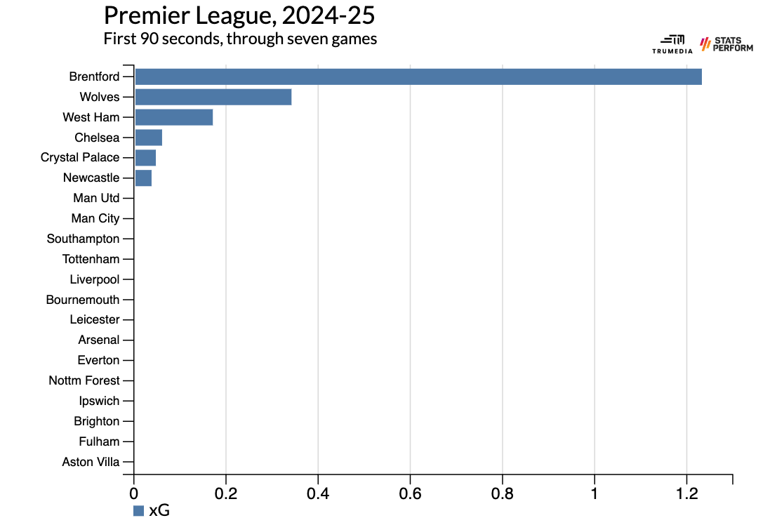 Теперь это не было бы такой громкой историей, если бы «Брентфорд» не забил эти голы. Согласно модели ожидаемых голов Stats Perform, три гола, забитые с начального удара, в сумме составили 0,54 ожидаемого гола. Им, вероятно, повезло, что они забили хотя бы один, не говоря уже о трёх. Но забивают они или нет, «Брентфорд» — огромный аутсайдер с точки зрения подхода к начальному удару.