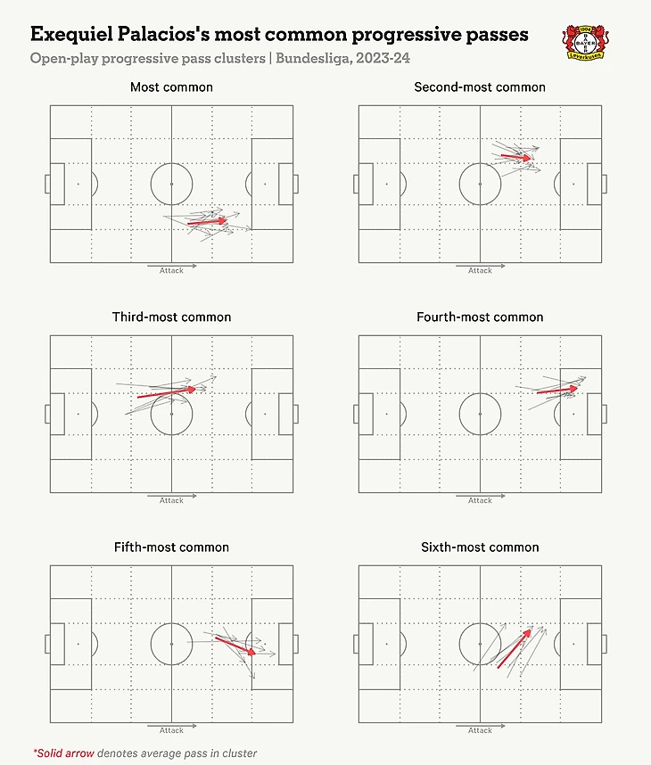 Эсекьель Паласиос, аргентинский полузащитник «Байера», очень хорошо держит мяч под давлением, и хотя он не так широко играет, как Родри, — его средняя дистанция паса в 13,6 м была самой низкой среди центральных полузащитников Бундеслиги в прошлом сезоне, — он один из лучших в Европе по продвижению мяча короткими пасами через линию и дриблингу в плотном потоке (хотя на нём тоже часто фолят).