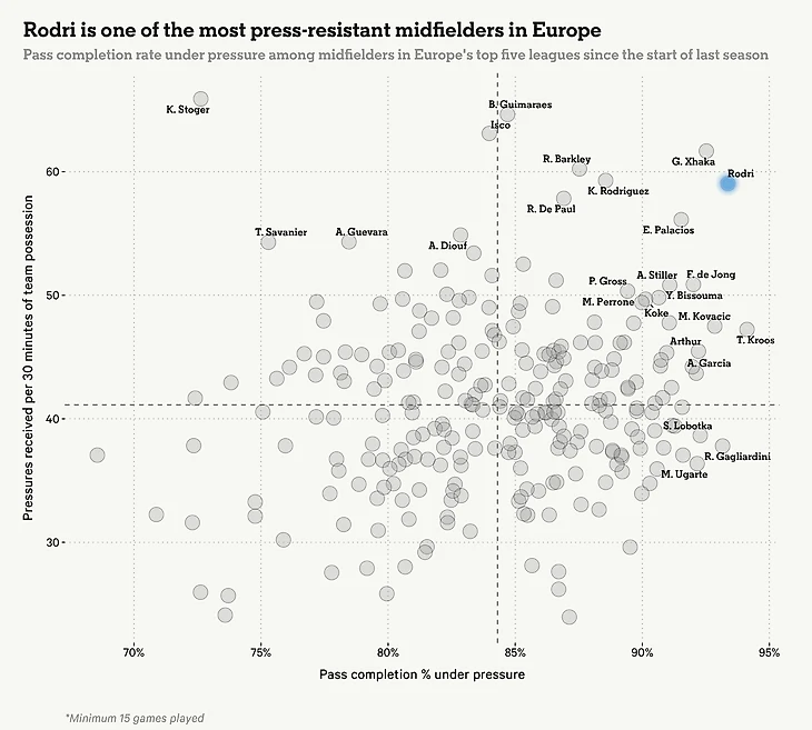 График показывает, насколько много работы приходится выполнять Родри под давлением, и любой игрок из этого правого верхнего кластера, демонстрирующий высокий процент успешных передач в сочетании с тем, как часто на него оказывают давление, в целом может считаться тем типом игроков, который подошёл бы любой команде «Сити», по крайней мере, с точки зрения стиля.