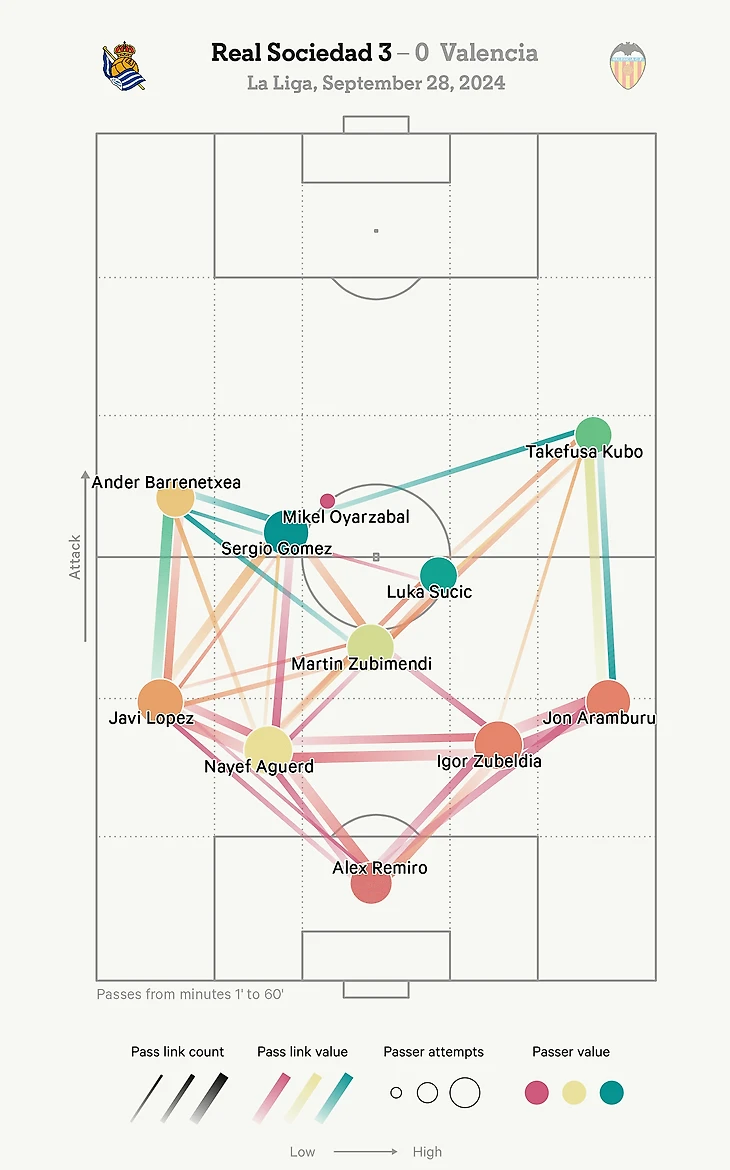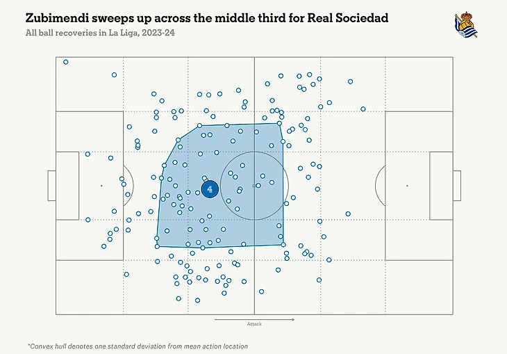 Его показатели редко зашкаливают, в основном потому, что он играет в глубине поля и делает меньше, если не сказать больше, сложных передач через перегруженную зону полузащиты. Однако Субименди кажется очевидным кандидатом на замену Родри, не в последнюю очередь потому, что он буквально сделал это для Испании в июле, когда игроку «Сити» пришлось покинуть поле из-за травмы в перерыве финала чемпионата Европы против Англии.