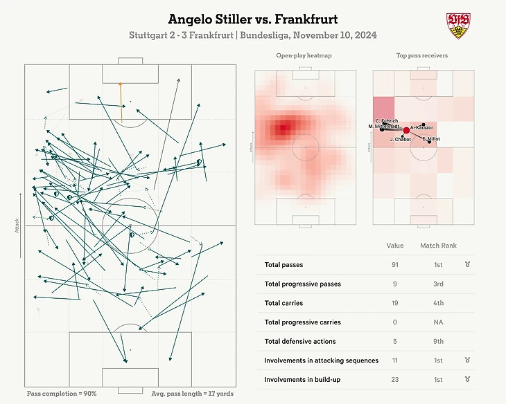 Его команда «Штутгарт» не была такой же доминирующей в владении мячом, как «Байер» в прошлом сезоне, но Штиллер выделяется своей активностью в передачах. Только пять полузащитников, в том числе Родри, выполнили большую часть передач своей команды (13,8%), что говорит о том, что он не уклоняется от ответственности в полузащите.