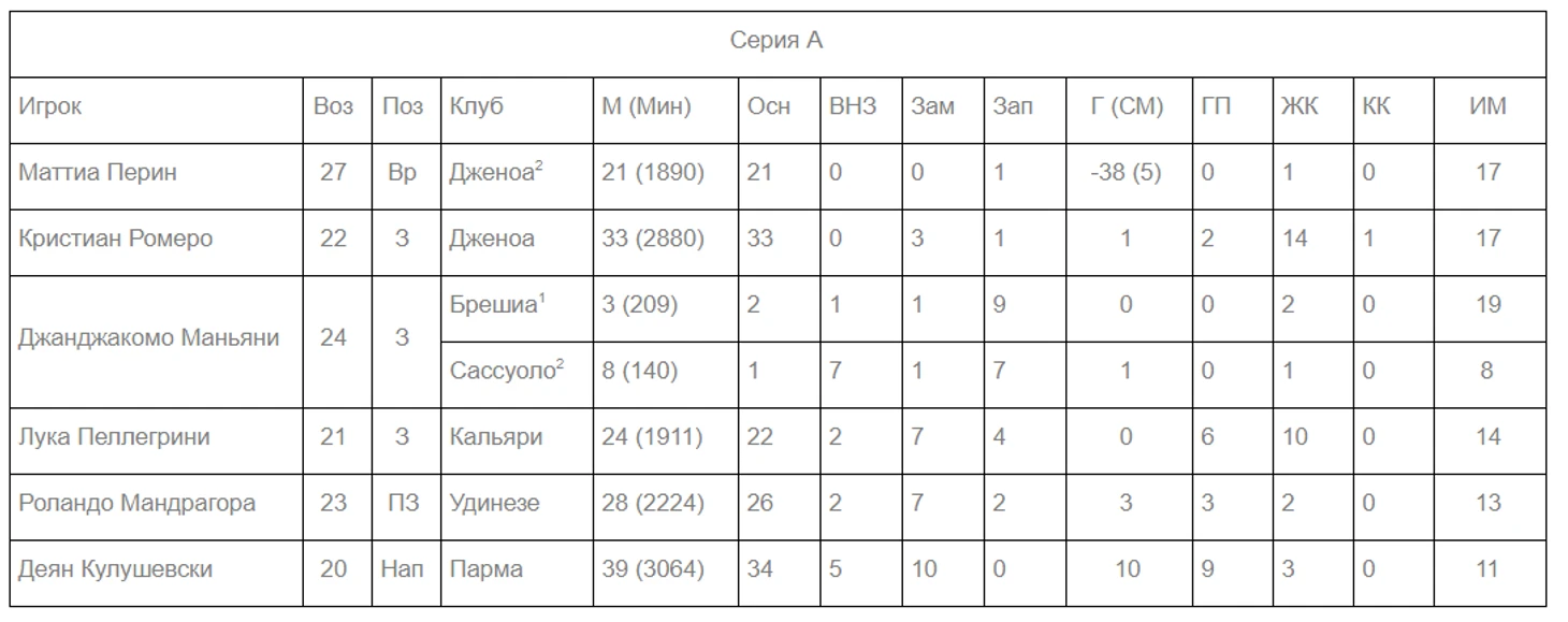 Маттиа Перин Возраст: 27 Позиция: вратарь Клуб: «Дженоа» Сезон 19/20: 21 матч (5 сухих), 38 пропущенных мячей, 1 ЖК