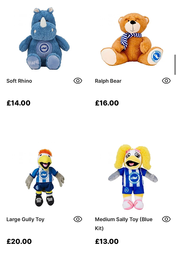 Здесь есть два вида плюшевых мишек, есть слон, жираф, носорог и две чайки в форме «Брайтона» - большая слева и маленькая справа. Такой подарок точно понравится ребёнку.