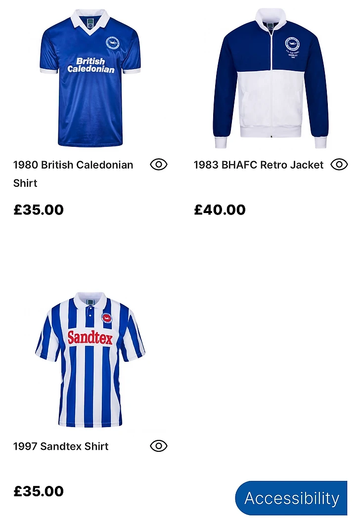 За те же 35 фунтов можно приобрести футболку 1980 года или футболку 1997. Заметьте, какая эмблема у формы 1997. Об эмблемах «Брайтона» я обязательно сделаю отдельную статью, так как их было очень много.