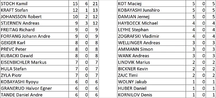 Бонусы за квалификацию: Стох - 3 очка, Стьернен - 2 очка, Крафт - 1 очко