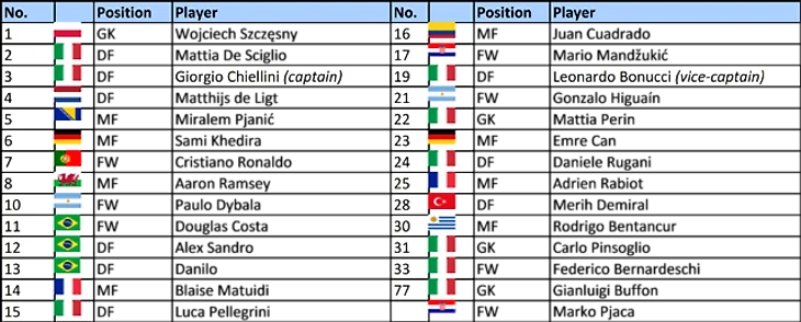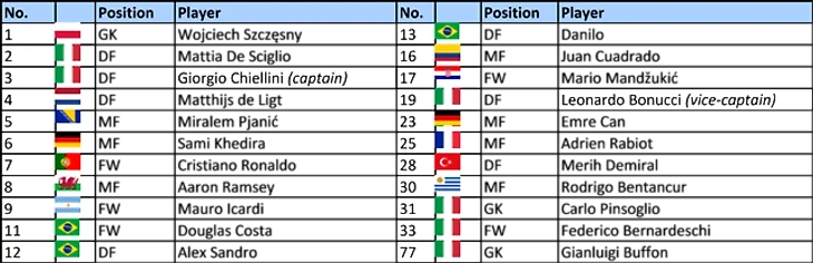 С заявками разобрались, теперь смотрим на нынешний состав «Ювентуса». 28 игроков, 4 вратаря, 9 защитников, 8 полузащитников и 7 нападающих. 19 легионеров и 9 итальянцев. 1 воспитанник (Пинсольо).