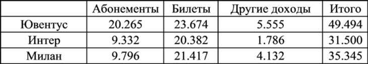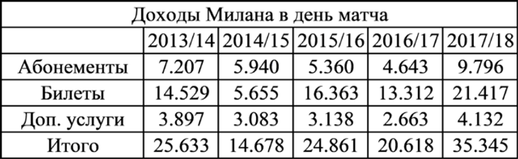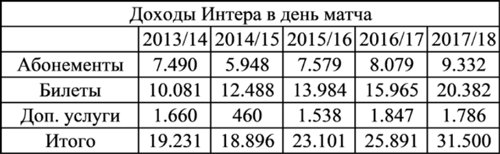 В частности, «Интер» в сезоне 2017/18 (без кубков) получил выручку в размере 31,5 млн евро, из которых 20,3 млн евро – билеты и 9,3 млн евро - абонементы.