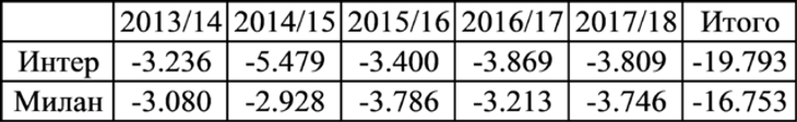 Цифры явно выше, чем у «Интера» и «Милана», которые за тот же период никогда не участвовали в Лиге чемпионов (за исключением, по данным «Россонери», доходов от одного матча с «Атлетико Мадрид» в 2014 году).