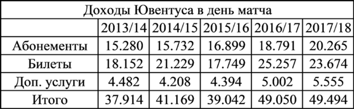 Были приняты во внимание доходы от абонементов, билетов и дополнительных услуг на стадионе (таких как гостеприимство и Sky Box). Цифра для «Ювентуса», благодаря постоянному участию в Лиге чемпионов и среднему росту цен, выросла почти до 50 миллионов евро в 2017/18 году.