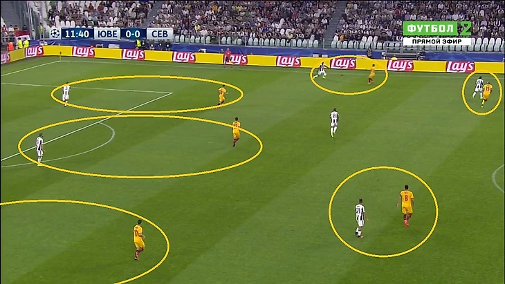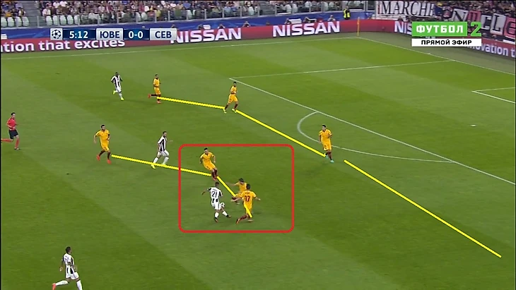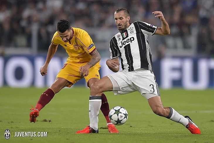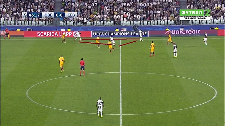 «Ювентус» начал агрессивно, провели несколько быстрых атак. И в первые пятнадцать минут, могли трижды поразить ворота Серхио Рико. Два момента было у Сами Хедиры, в первом случае немцу не хватило точности, а во втором расторопности. У «Севильи» мало что получалось, активный прессинг со стороны игроков в черно-белой форме полностью разрушал созидательную активность.