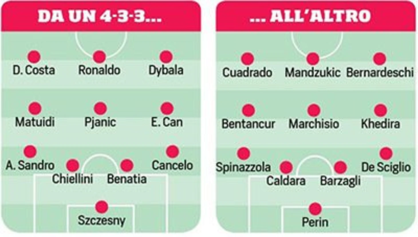 В такой расстановке замены по позиции будут усиливать и освежать игру, не меняя каких-то ключевых аспектов игры. Можно усилить группу атаки, трансформируя схему в 4-2-3-1, с Манджукичем на острие, Роналду слева, Дибалой под нападающим, и с Бернардески/Куадрадо справа. И с Пьяничем и Матюиди в полузащите.